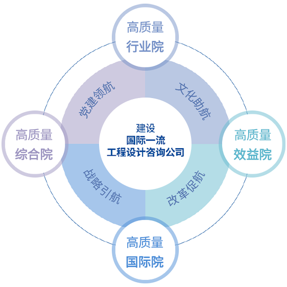 坚持“党建领航、战略引航、改革促航、文化助航”,着力打造高质量发展“行业院、综合院、国际院、效益院”,简称“四航四院”总体发展思路。