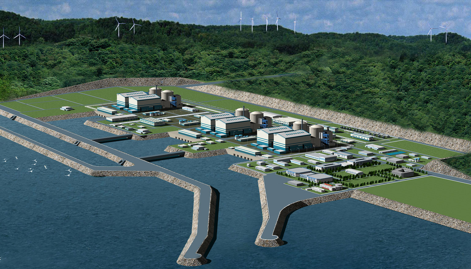 建设6台机组,总装机容量6000MW。承担了一期、二期工程(除34号机组排水暗涵以外)所有海工构筑物的工可、初步设计、施工图设计工作,建设内容包括取水明渠南导流堤长约780米,取水明渠北导流堤306米,排水明渠南导流堤1890米,排水明渠西导流堤1720米,排水明渠东导流堤700米,中隔堤1410米,厂区护岸总长2880米,暗涵1151米,一座3000吨级大件码头和防冰拦污设施。