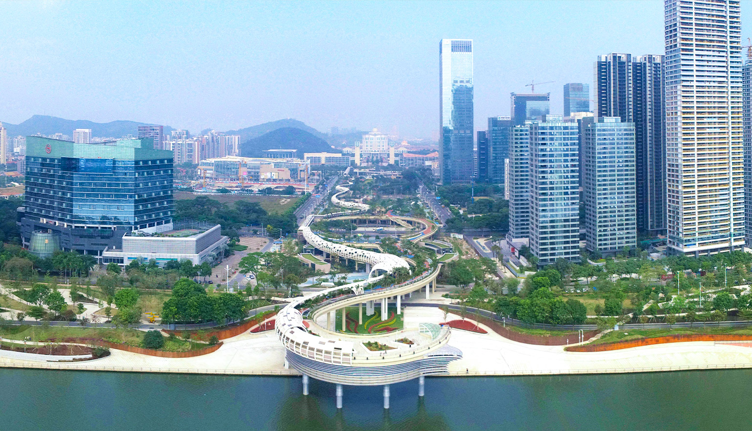 项目正对顺德区政府大楼,是顺德区的核心轴线,总面积约 11.9万平米。项目设计理念结合了顺德的别称“凤城”,以凤凰抽象构图为设计灵感,分上下两层立体景观桥梁结构及绿化设计。