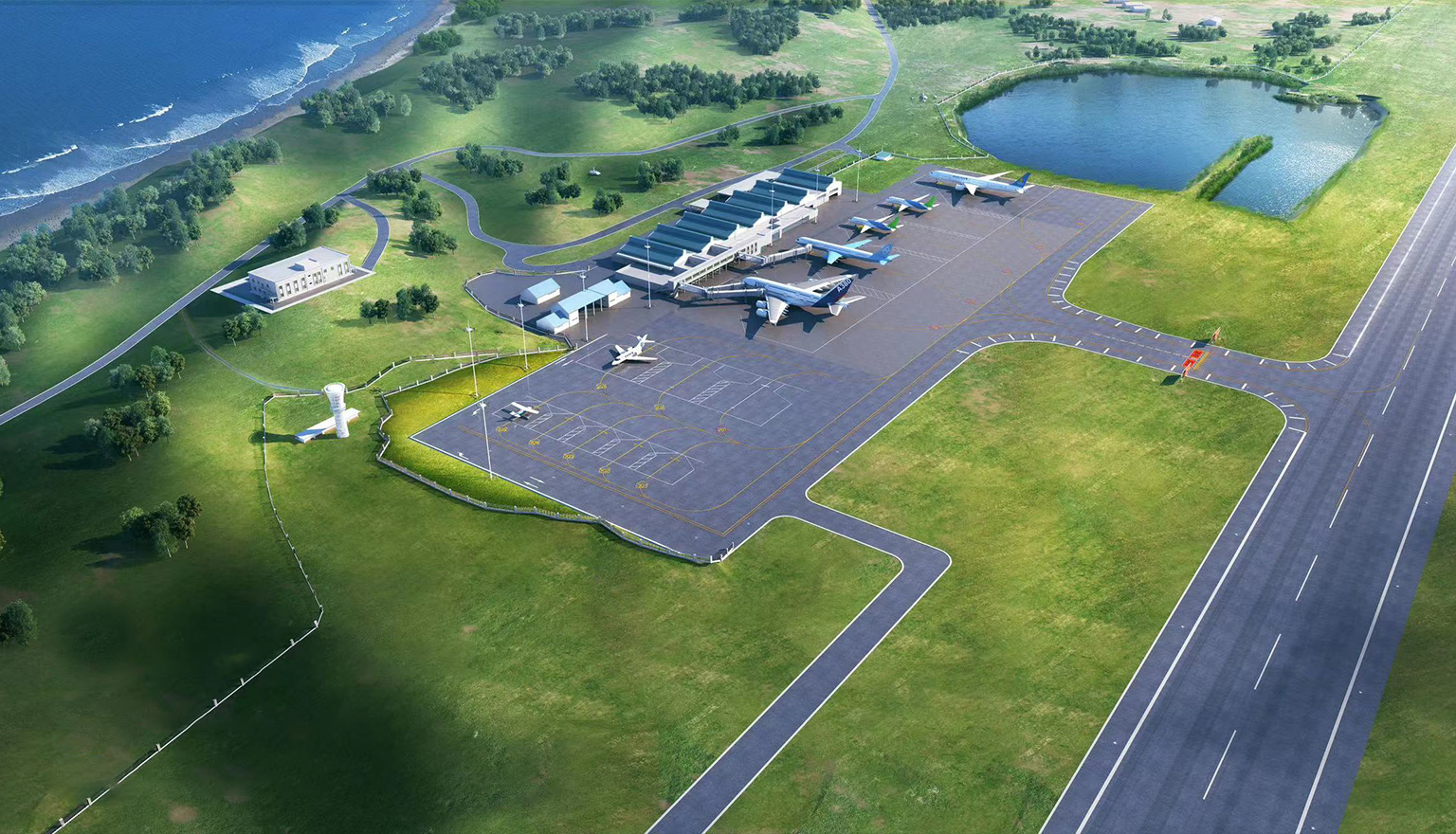项目位于东加勒比海最南端,建设内容主要包含对原有2743米跑道道面修复、机场老旧设施更新、停机坪和滑行道扩建,新建 2 个登机桥及机场外围道路修复和重建应急中心办公楼。